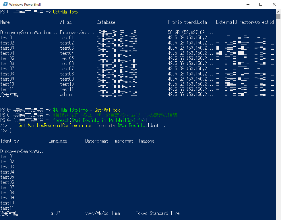 その後、取得したメールボックスの中から「DiscoverySearchMailbox」以外でタイムゾーンの設定が未設定のものを「Set-MailboxRegionalConfiguration」コマンドを使用して、すべて「日本」に設定している。