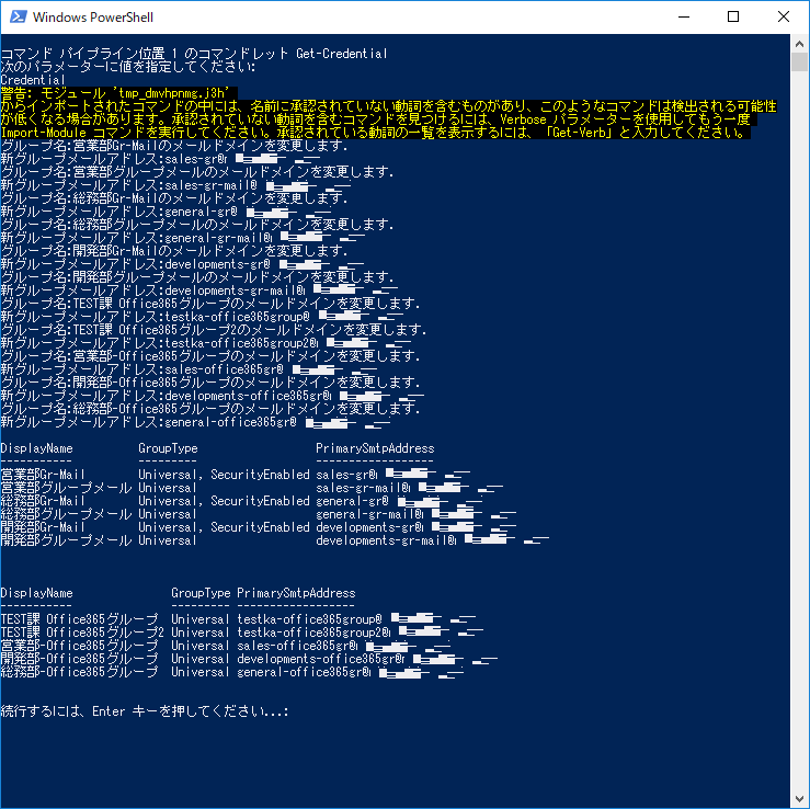 Write-Output 新グループメールアドレス:$GroupPrimarySmtpAddress