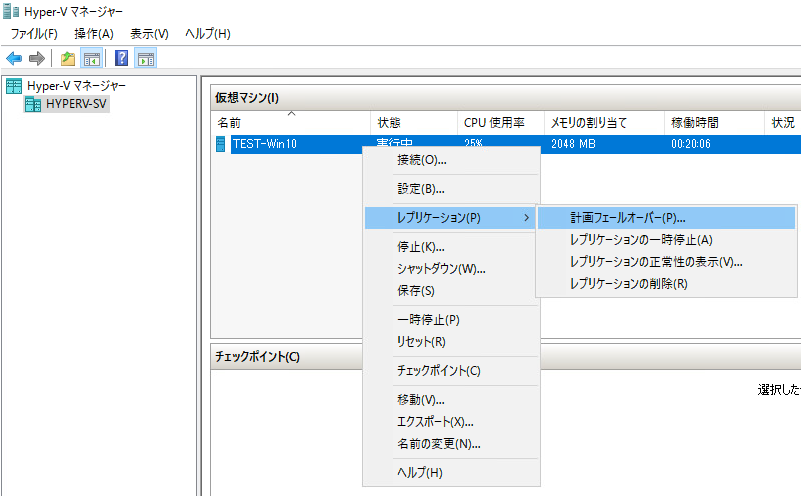 「計画フェールオーバー」を実施するのは当然、本番系(レプリケーション元)のサーバーから行います。(今回のテスト環境では「hyperv-sv」となります)