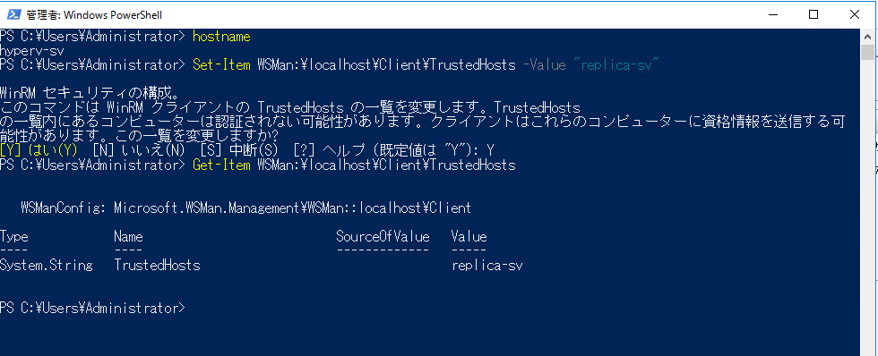 >Set-Item WSMan:\localhost\Client\TrustedHosts -Value "<リモート コンピューター名>"