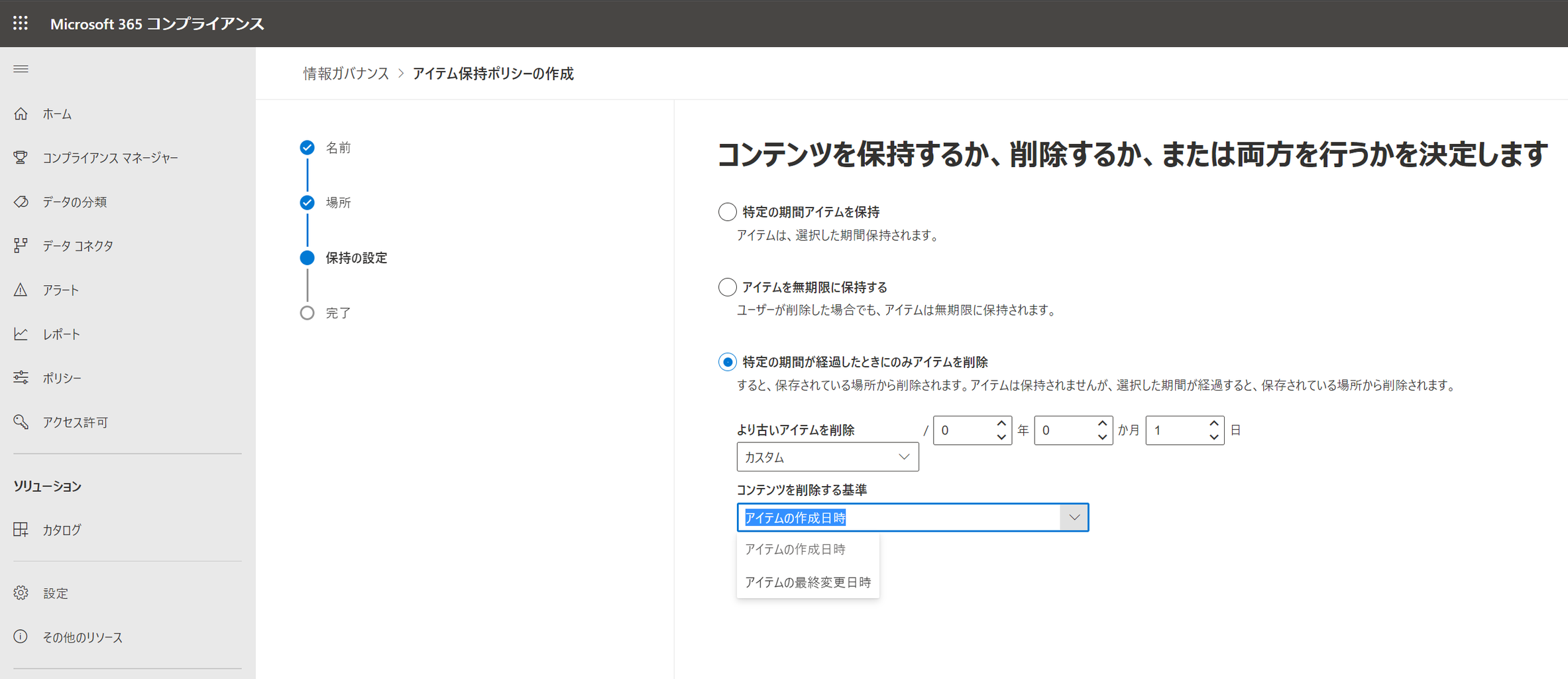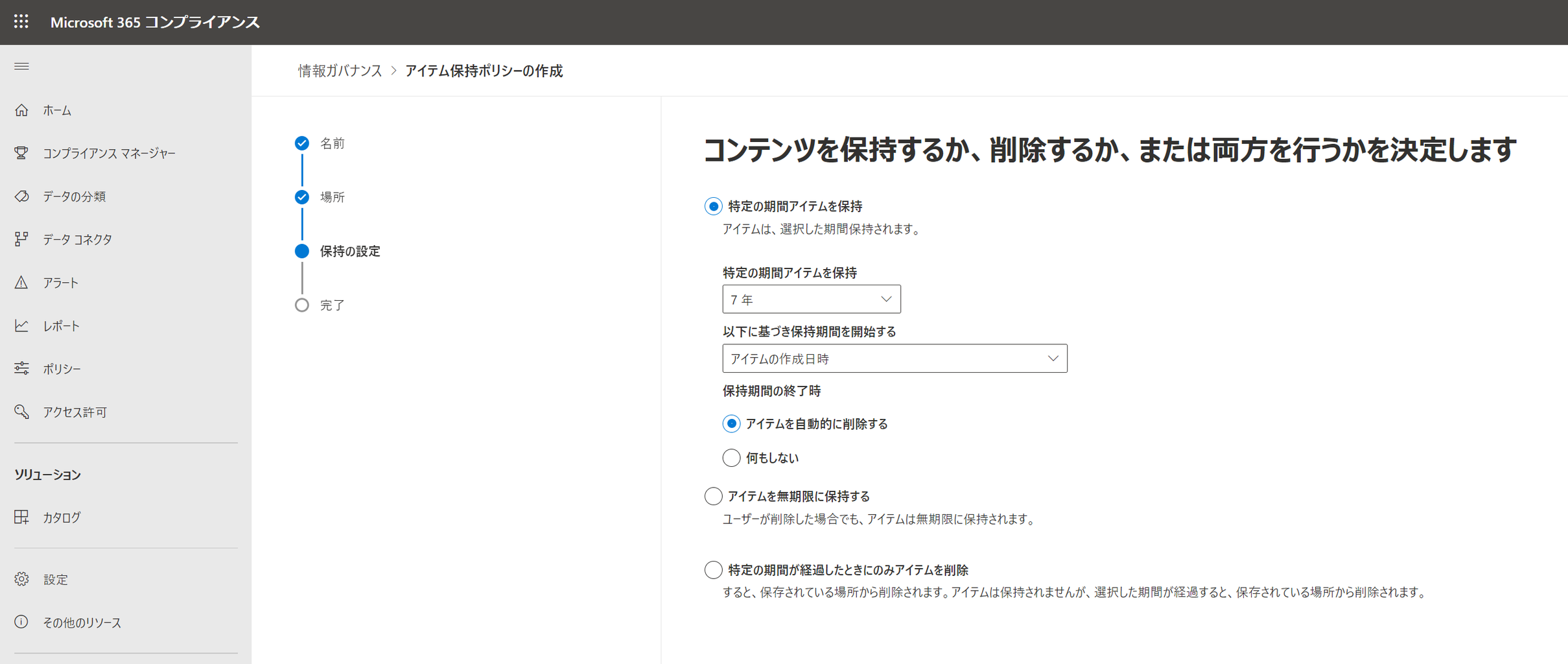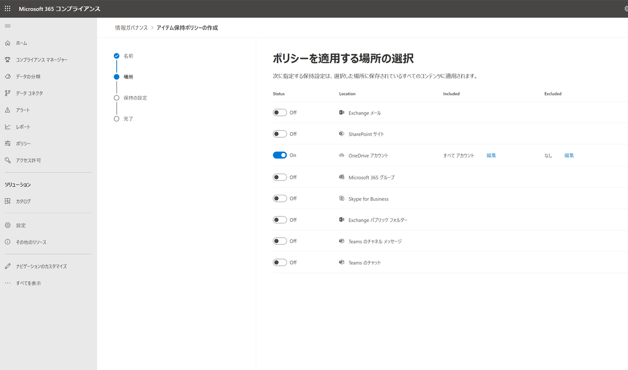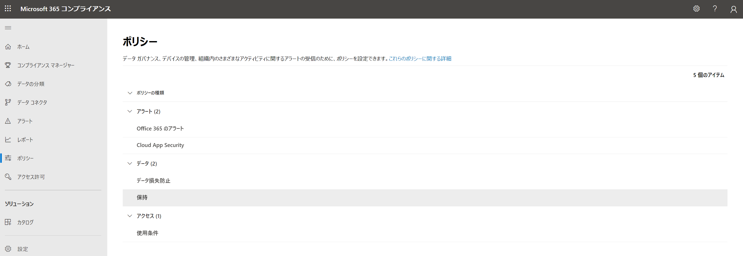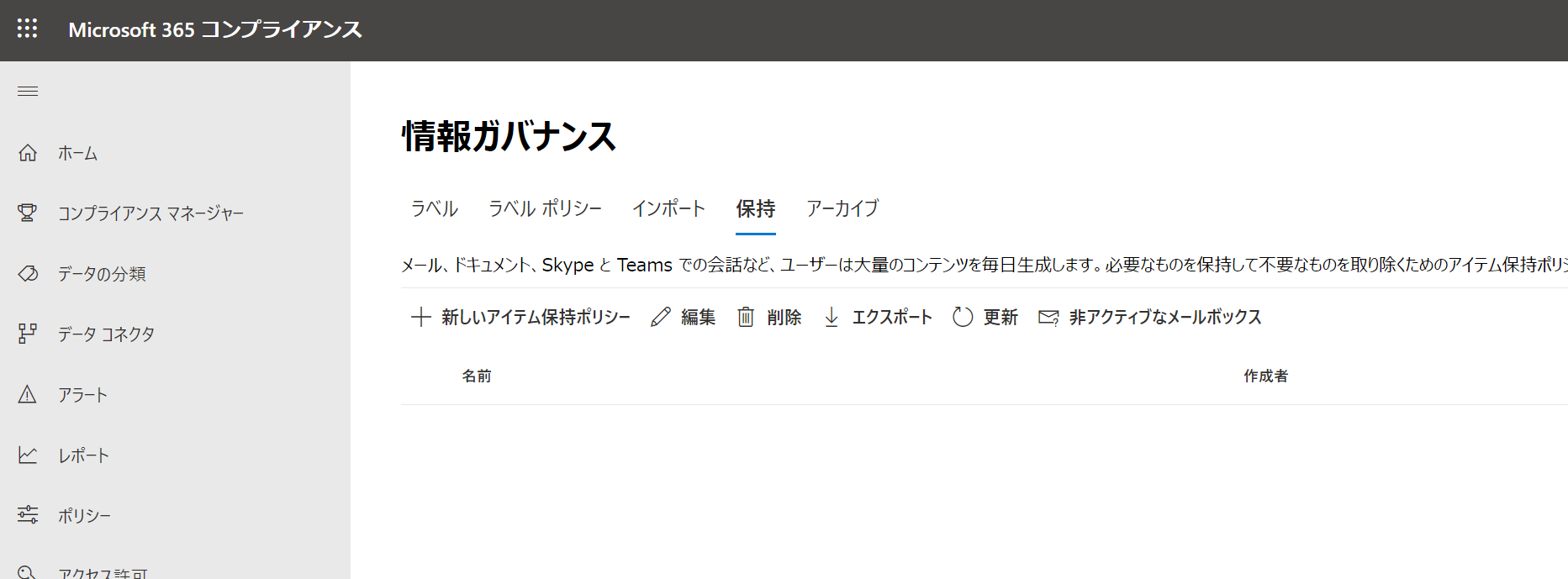>コンプライアンス 管理センターにアクセスした後、「ポリシー」-「データ」-「保持」をクリックします。