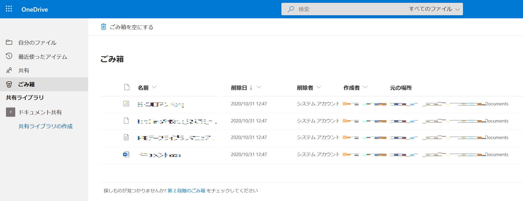 OneDriveのゴミ箱にファイルが行っているのがわかります。