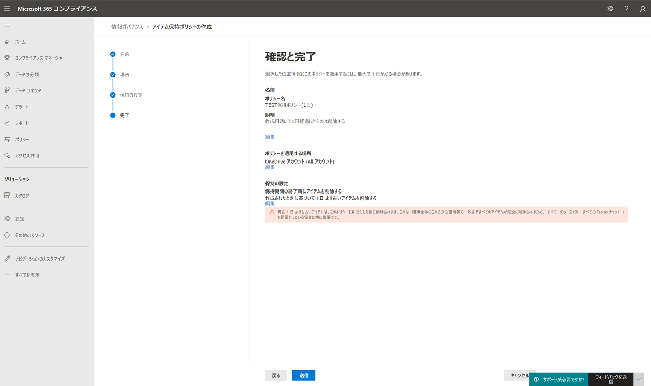 今回は検証なので、OneDriveに保存されているファイルの中で「1日」以上経過したファイルを削除するポリシーを作成して、実験しました。