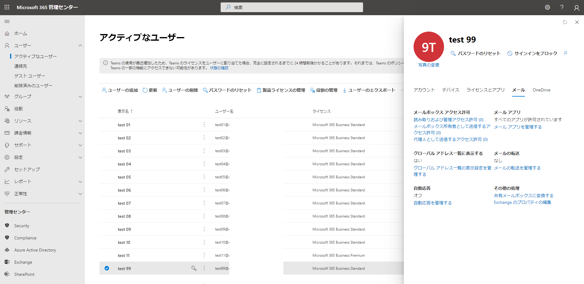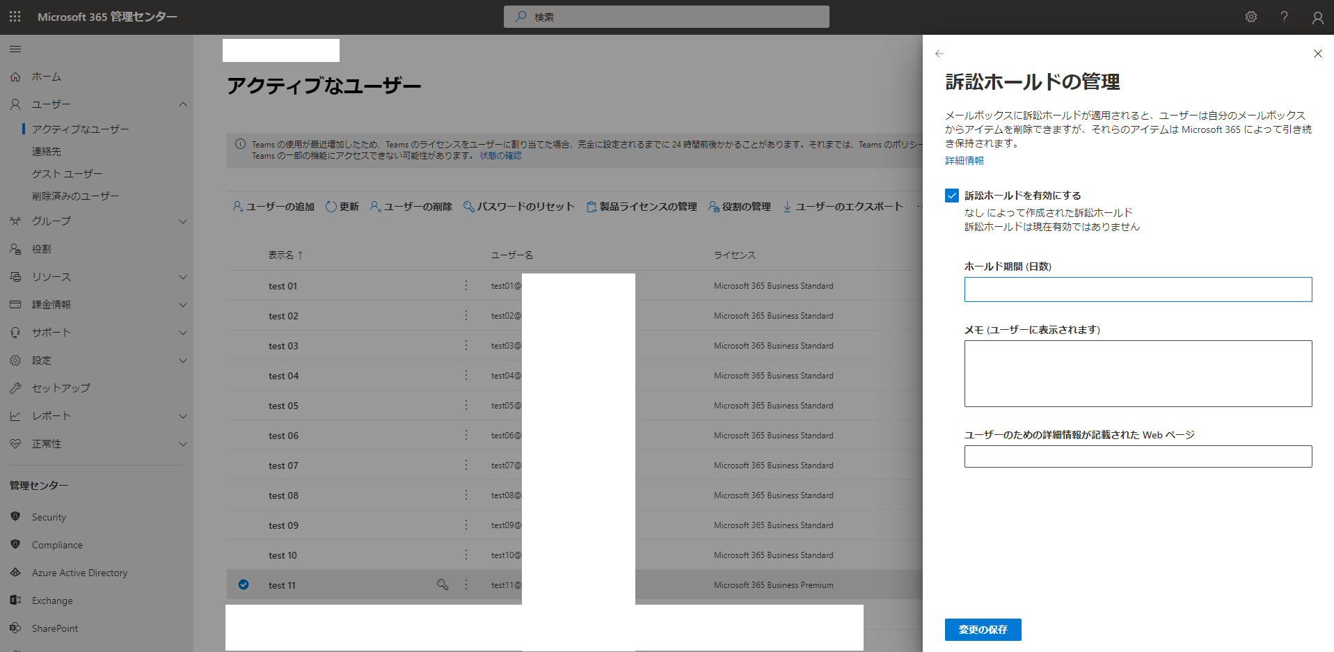 今回は比較する為に以下の3ユーザーを作成して検証してます。- test09 EOAライセンスなし、訴訟ホールド未設定(というか出来ない)