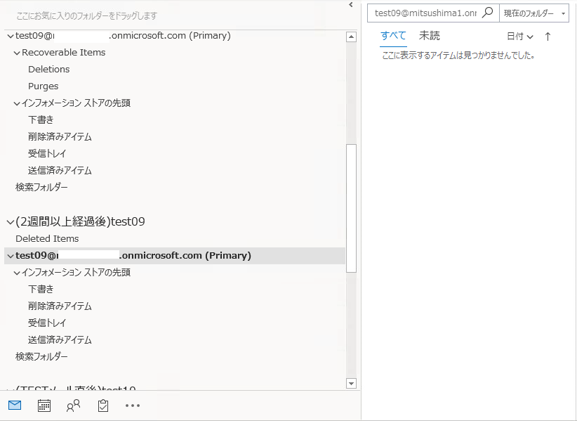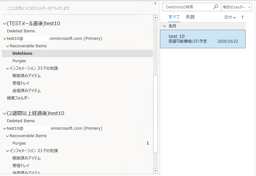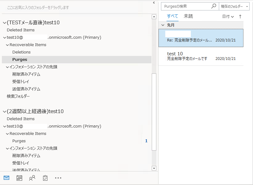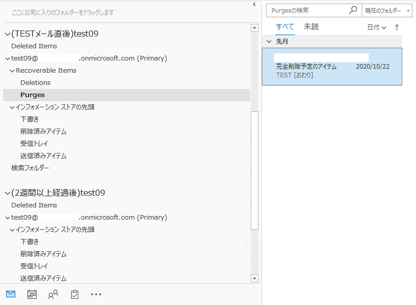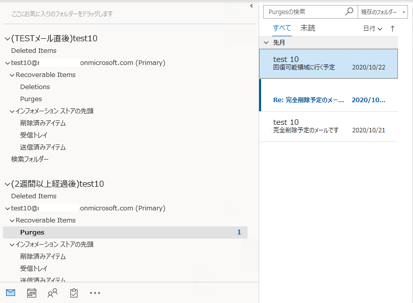 また、14日間経過したので「回復可能領域」から「Purges」フォルダへメールが移動しているのがわかります。