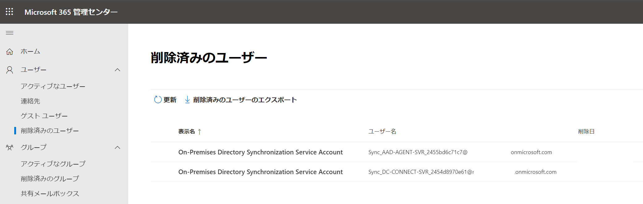 連携用ユーザーを削除する際には、Microsoft 365管理センターからは削除出来ません。