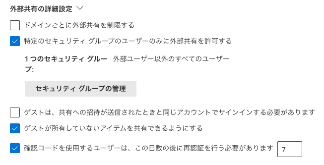 また、追加設定として「特定のセキュリティグループのユーザーのみに外部共有を許可する」を設定した方が無難です。