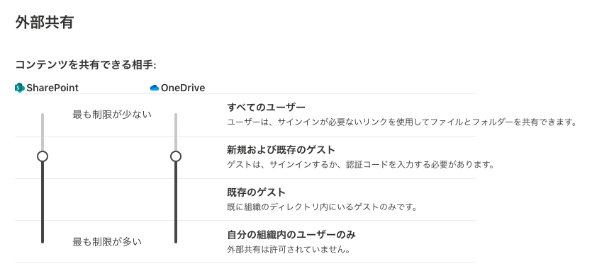 SharePoint管理センターへアクセスして、「ポリシー」-「共有」の「コンテンツを共有出来る相手」が「新規および既存のゲスト」になっていることを確認する。