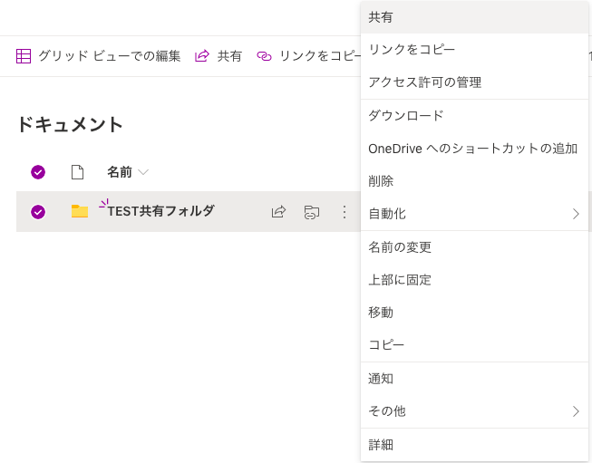 今回は「TEST共有フォルダ」を外部共有する想定で検証しています。該当のフォルダを選択した上で「共有」をクリックします。