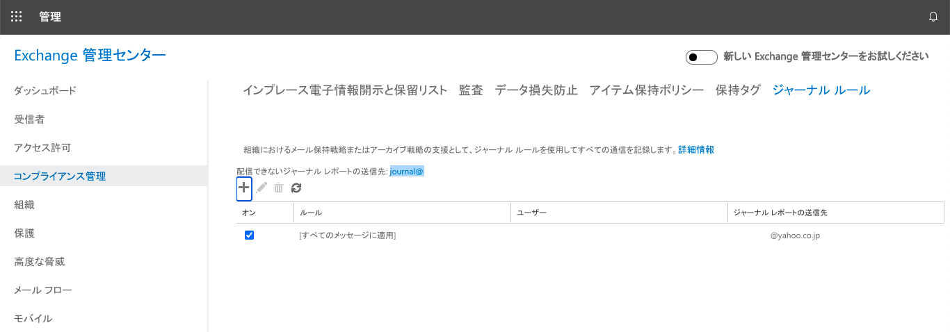 ここまでで各種送信先となるメールが準備出来たので、最後にExchange管理センターから実際にジャーナルルールを設定していきます。