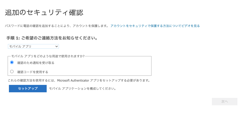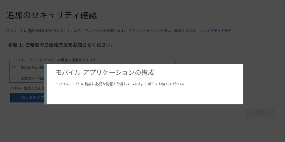 「モバイルアプリ」を選択して、「確認のため通知を受け取る」で今回はやっていきます。