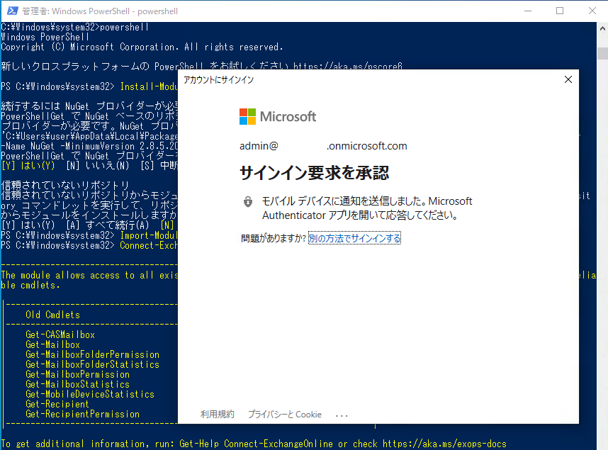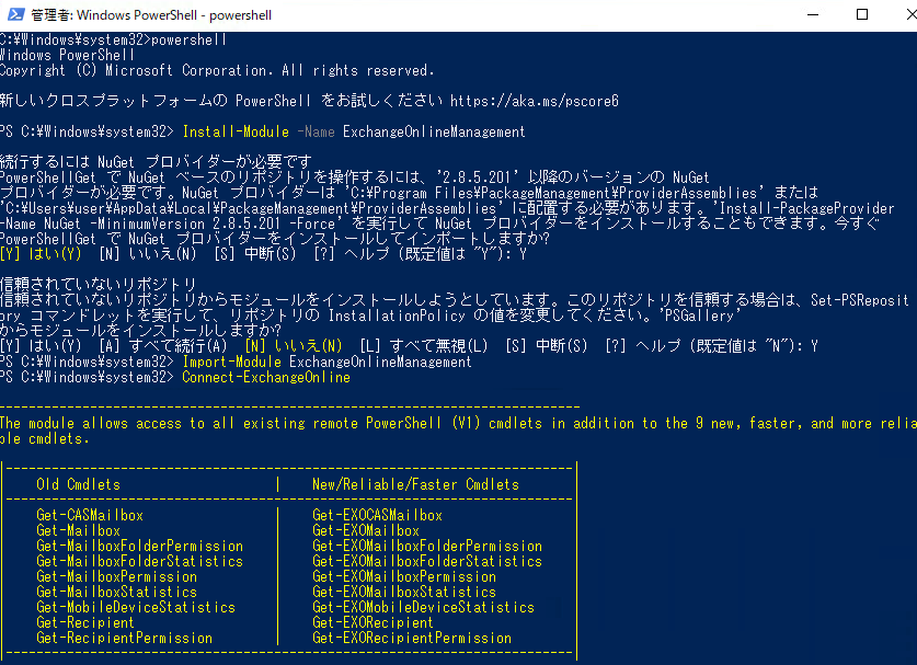- EXO V2モジュールをインストールする 「Install-Module -Name ExchangeOnlineManagement」