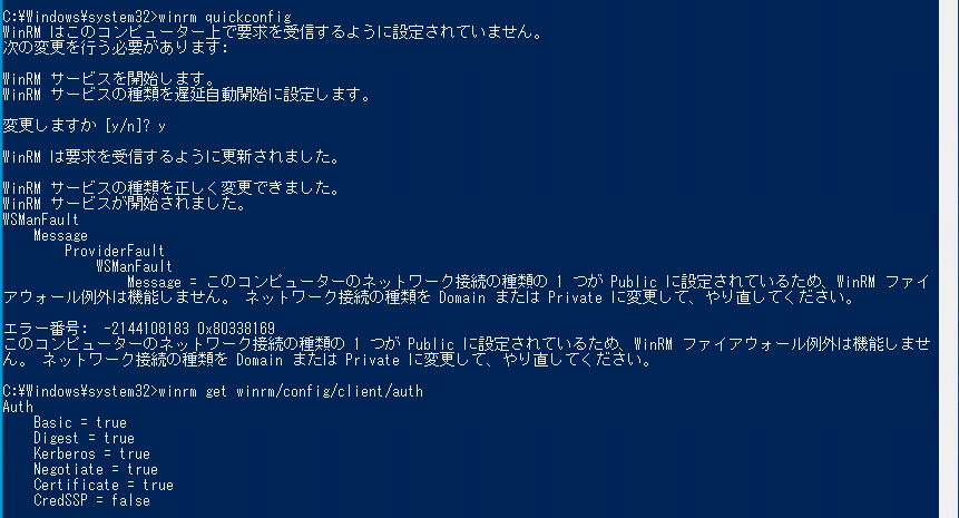 「winrm get winrm/config/client/auth」コマンドを実行しているのですが、クライアントOSだとサービスが起動していないせいかエラーになったので、その前に「winrm quickconfig」コマンドでサービスを起動させてから実行します。