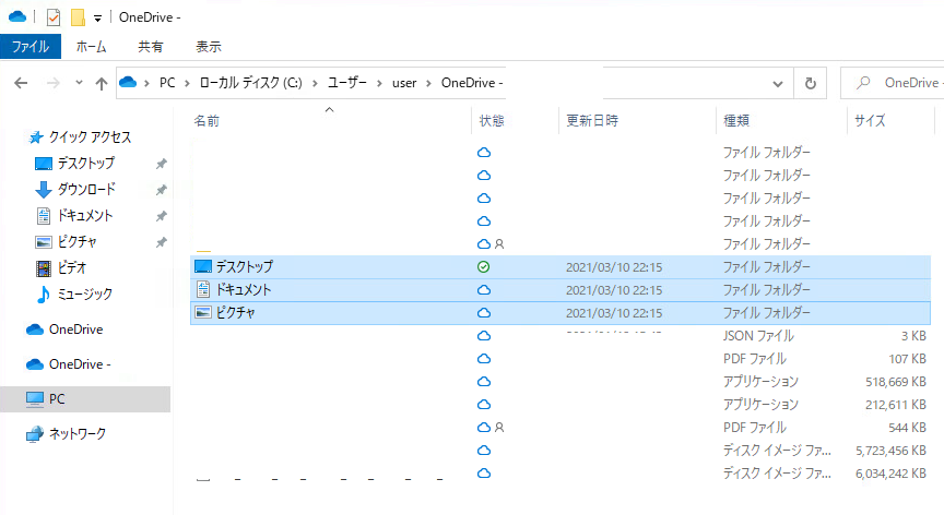 実際にOneDriveフォルダーを開いてみると「状態」という列からファイル(フォルダ)がどういう状態かがわかりますね。