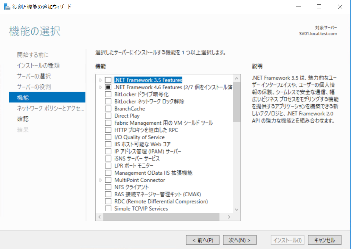まずは機能の追加から。サーバーマネージャーの機能追加よりインストールしていきます。