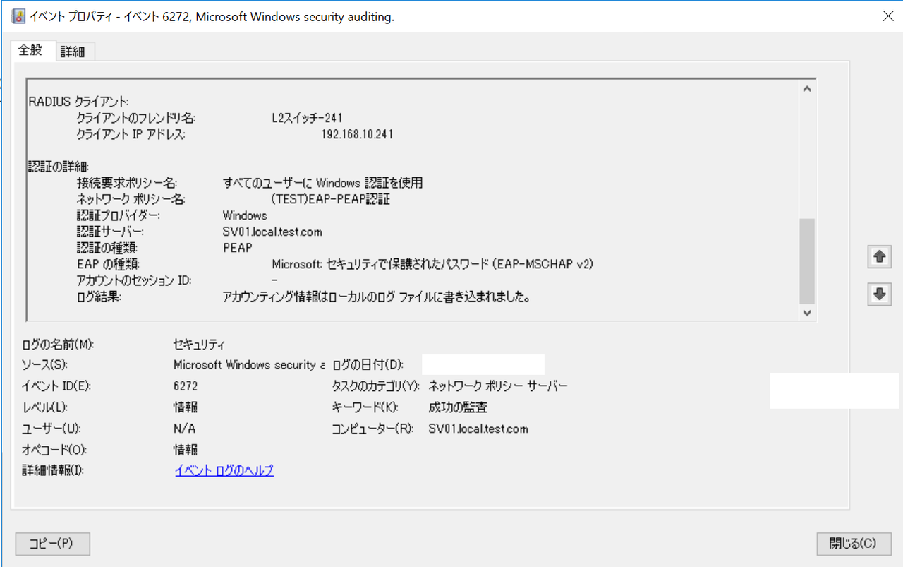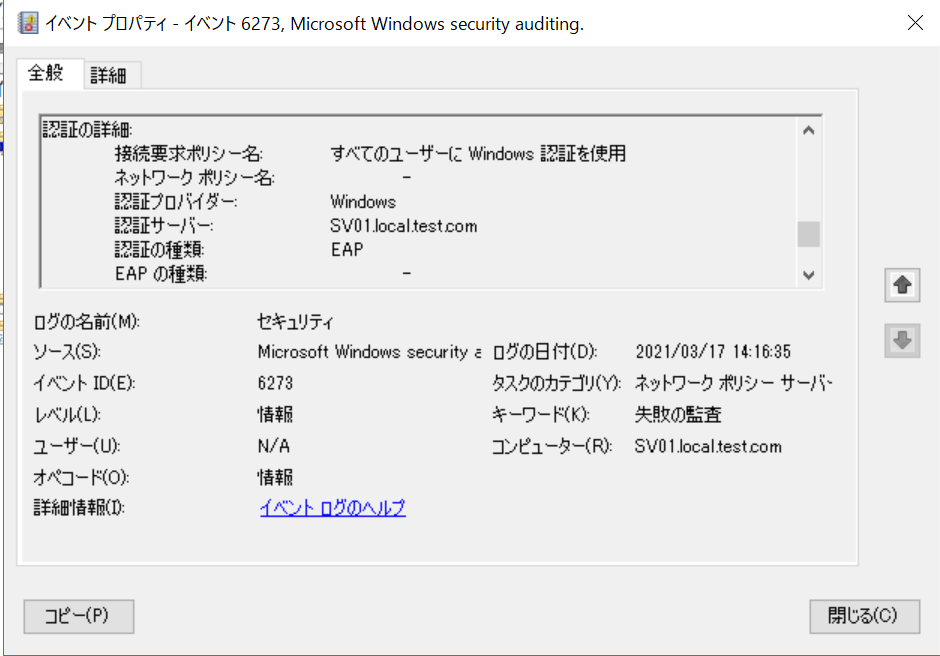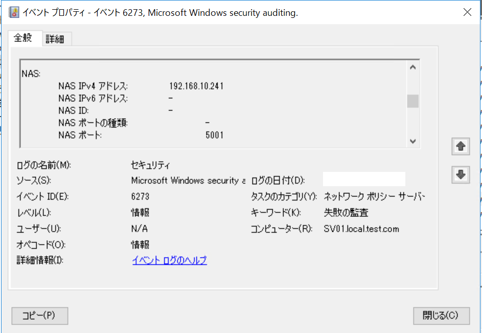 ※検証直後はポリシー内の条件で「NASポートの種類」に「イーサネット」を指定していたのですが、これが原因で全然上手くいきませんでした。。。orz (上記はその時のログとなります)