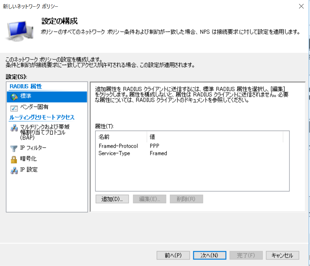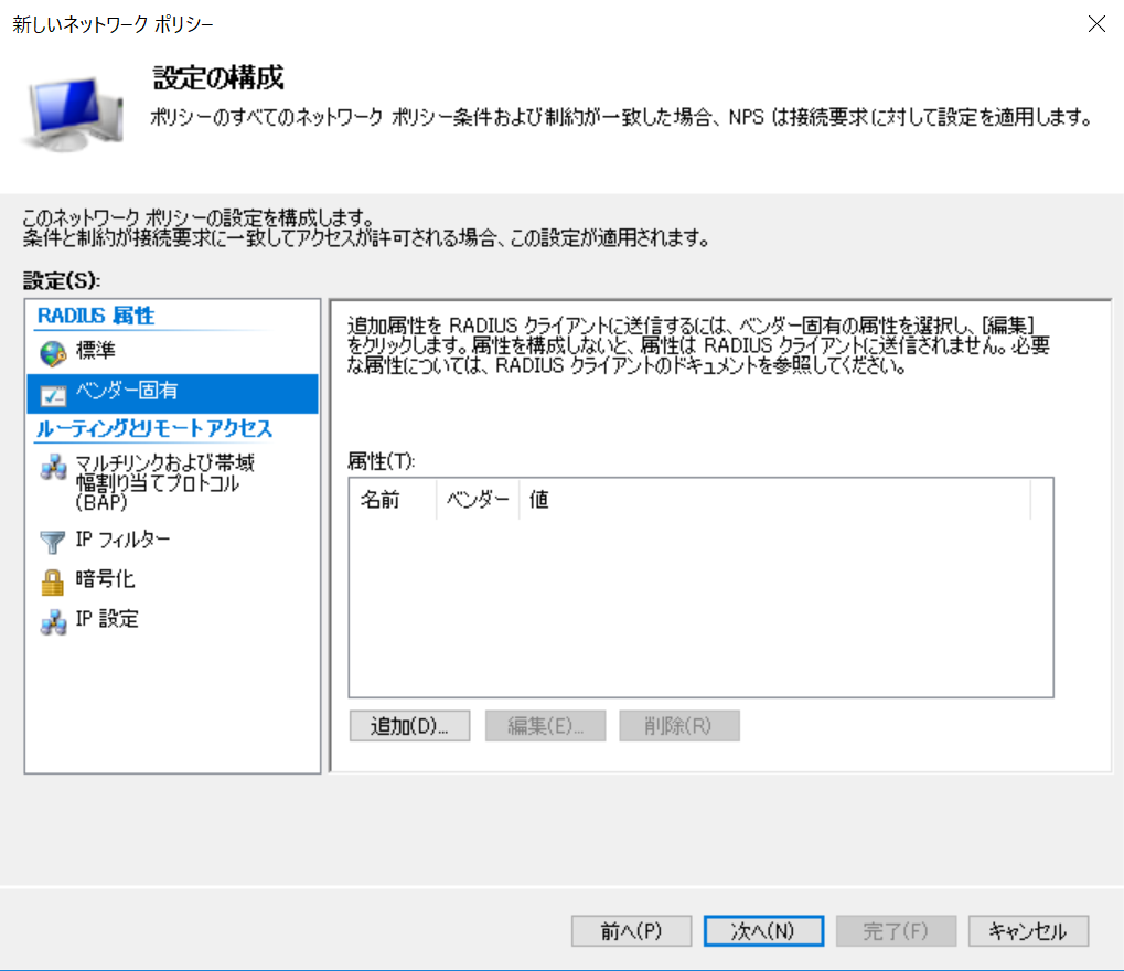 「RADIUS属性」等、他の設定も今回は初期値のまま進めます。
