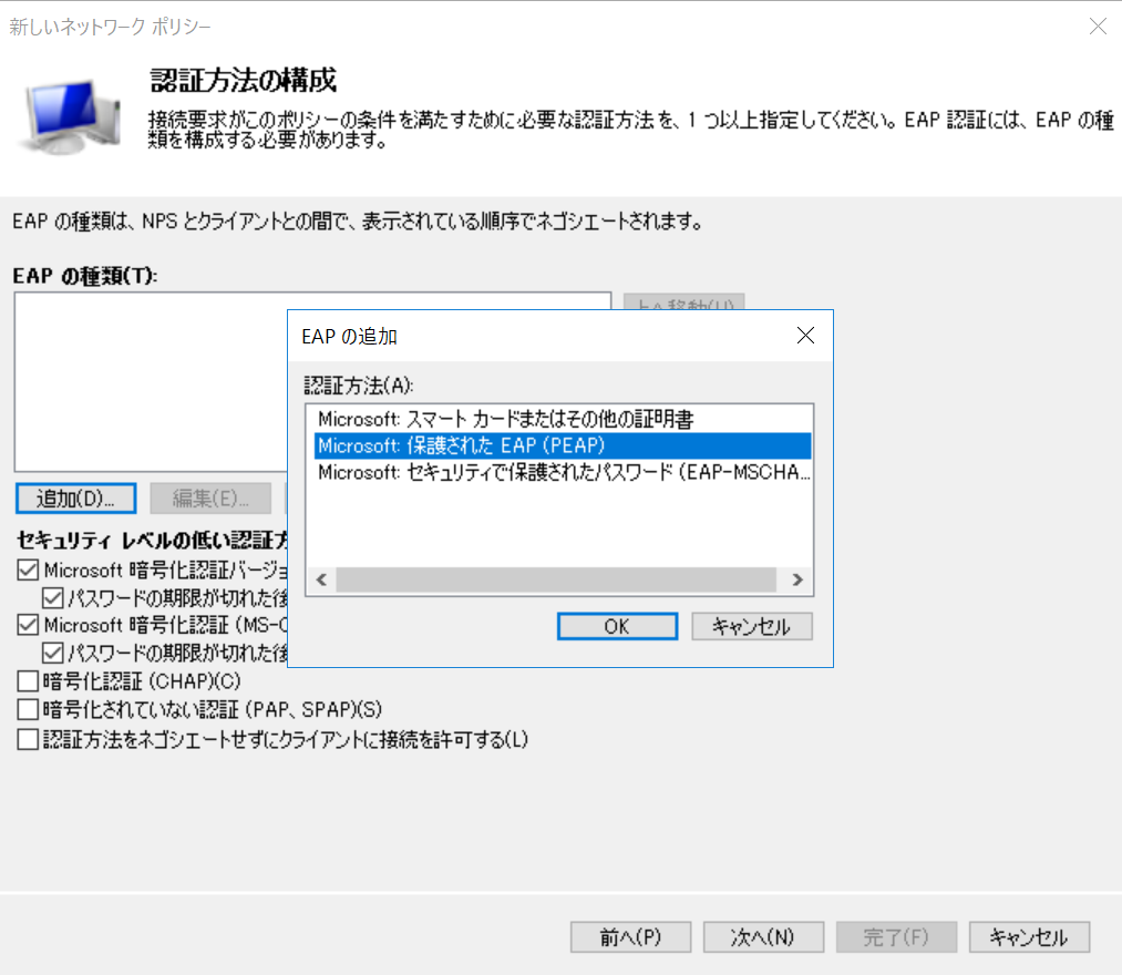 「認証方法」について「EAP-MSCAHP v2」を使用する想定なので、「Microsoft 保護されたEAP(PEAP)」を追加します。