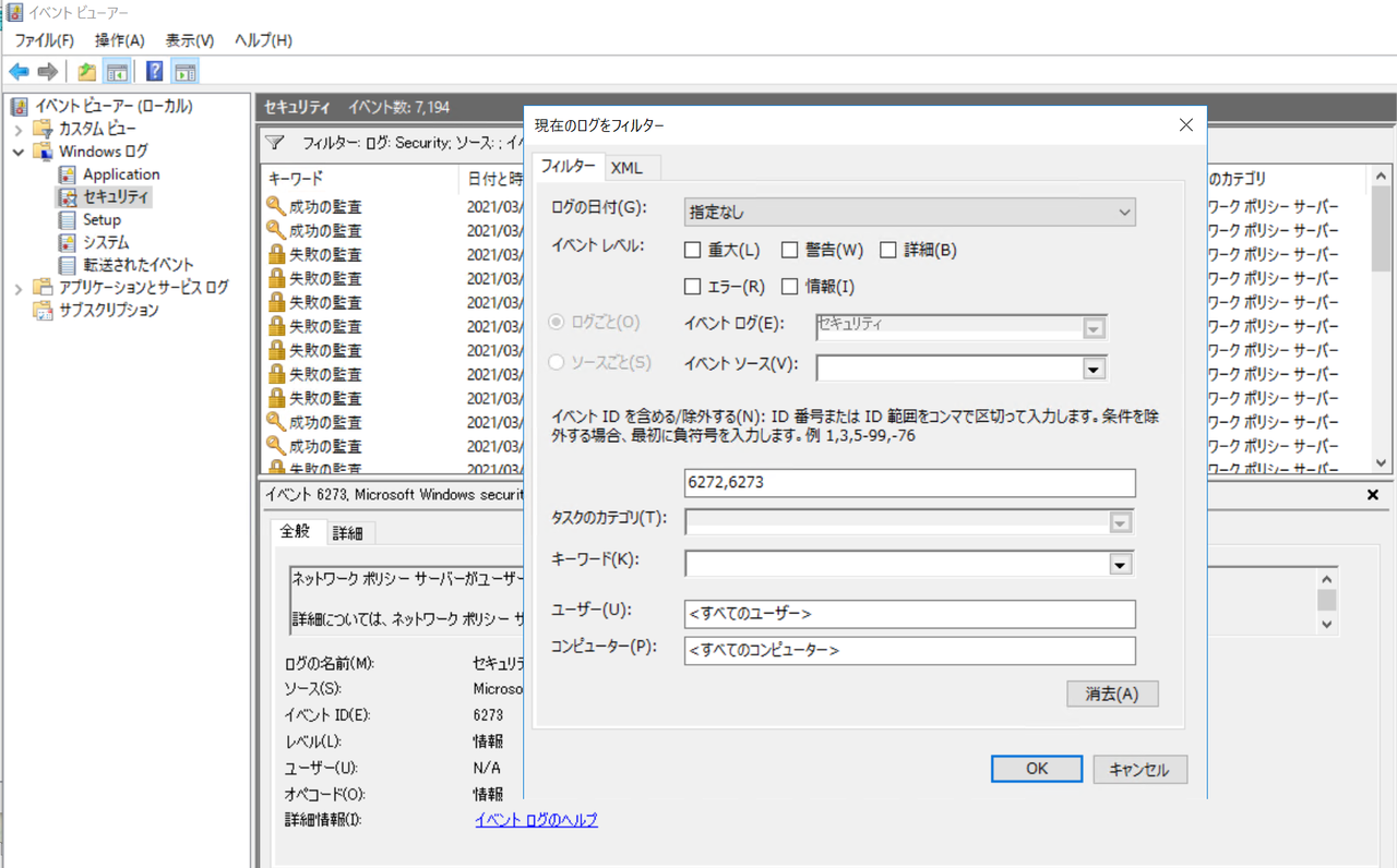※イベントID「6272」「6273」で絞ると検索しやすかったです。