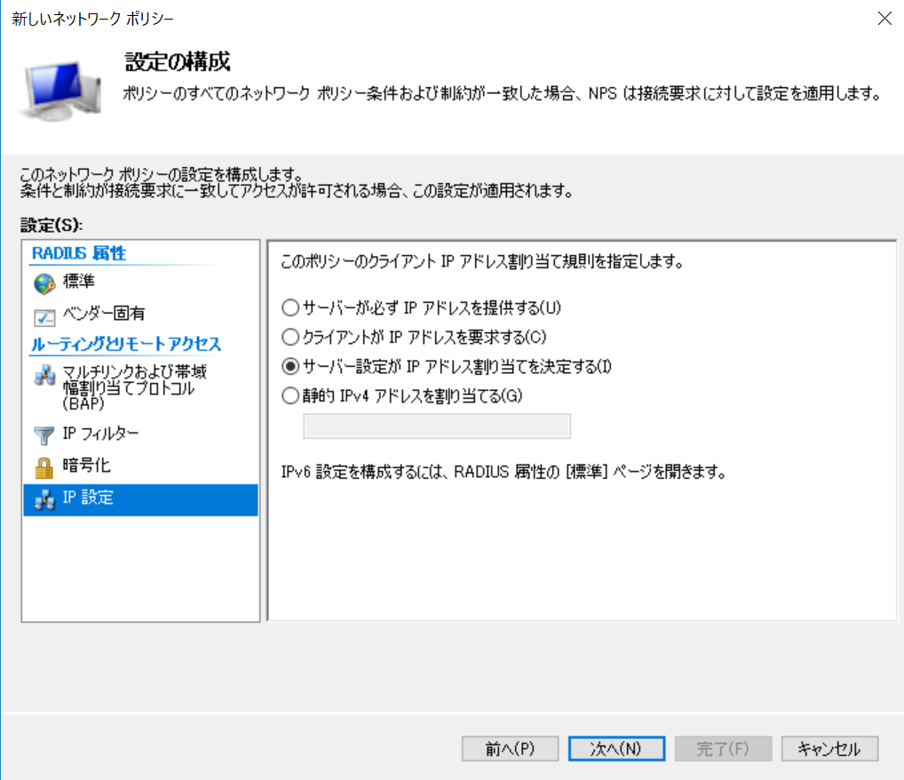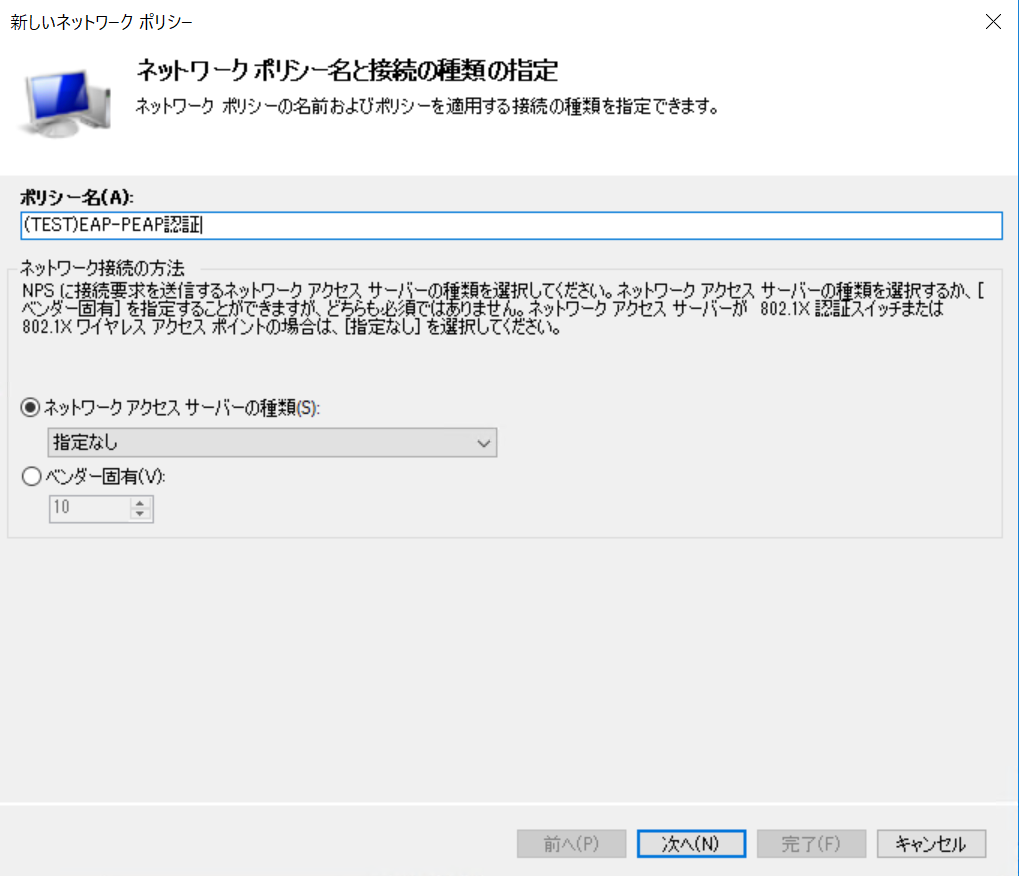 ※「ネットワークアクセスサーバーの種類」は「指定なし」のまま進みます。