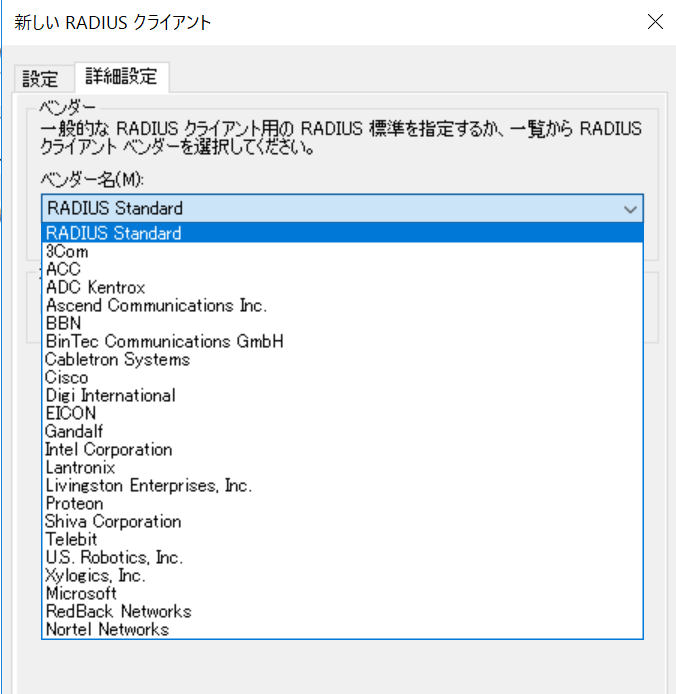 ※ベンダー選択で色々と選択出来るようですが、デフォルトの「RADIUS Standard」でいいと思われます。