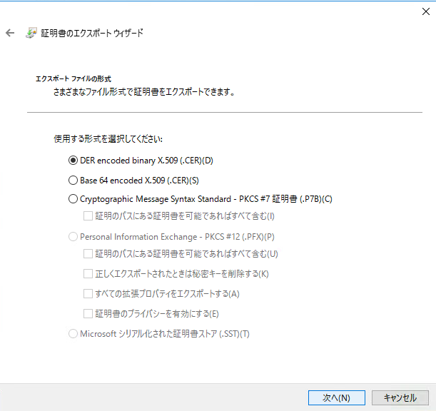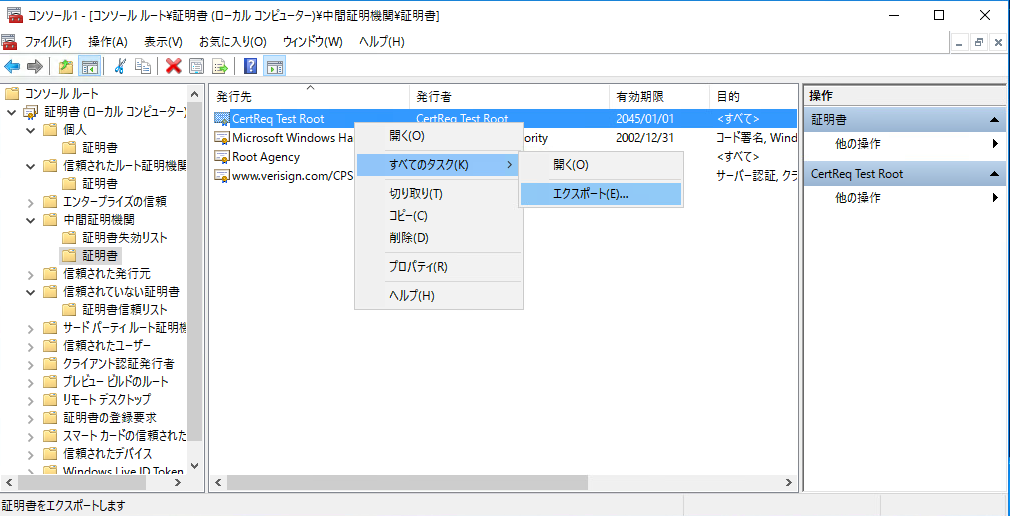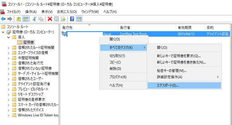 「個人」の中に先程生成したサーバー証明書があるので、右クリックより「エクスポート」します。