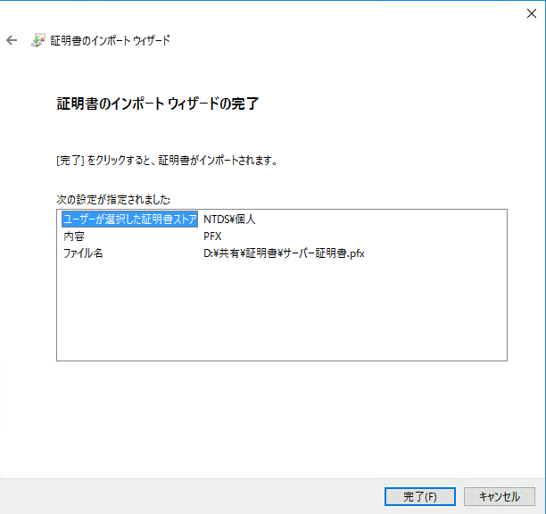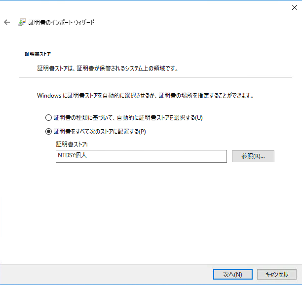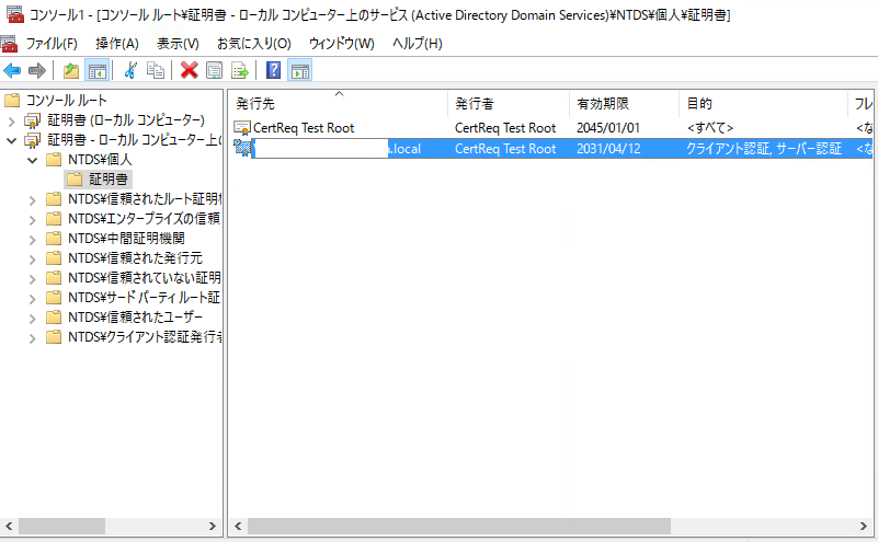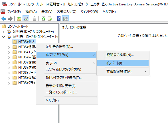 証明書「NTDS¥個人」に「サーバー証明書」をインポートします。