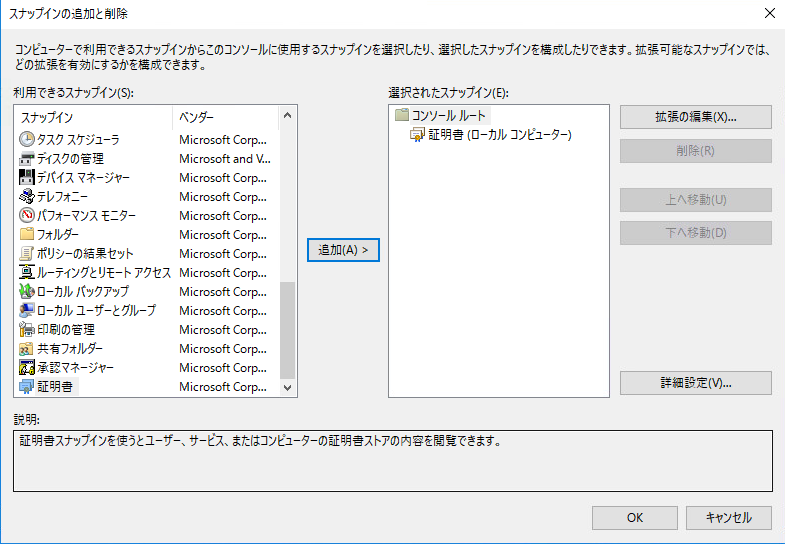 「証明書(ローカルコンピューター)」をスナップインとして追加します。
