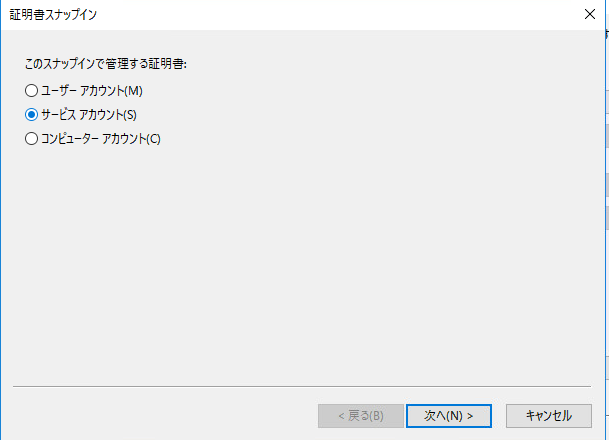 今度はスナップインの追加にて「サービスアカウント」-「Active Directory Domain Services」を選択します。