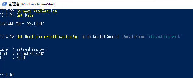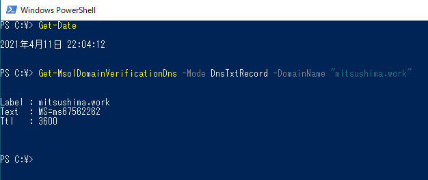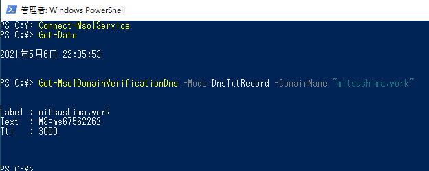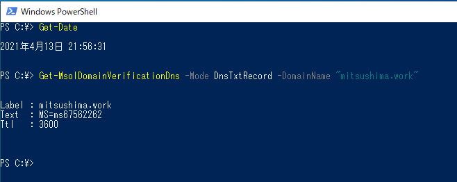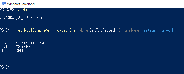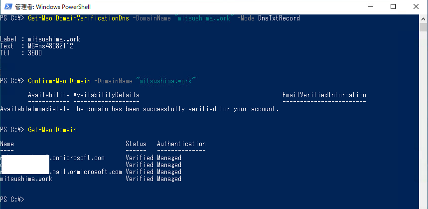上記例では手動で所有権確認コマンド「Confirm-MsolDomain」を実施してますが、これ自体は必須ではないです。