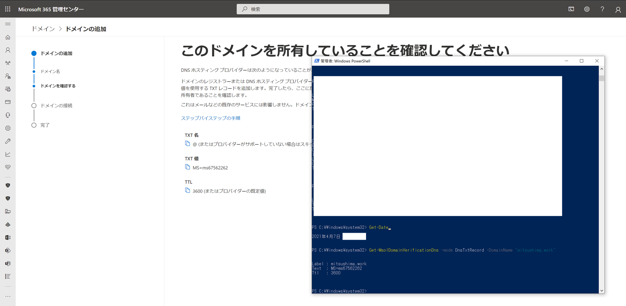 通常の手順通りMicrosoft 365管理センターから独自ドメインを追加し、TXTレコードを確認します。