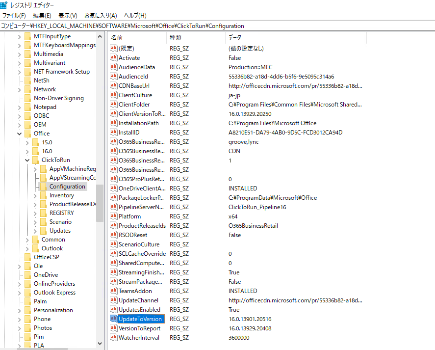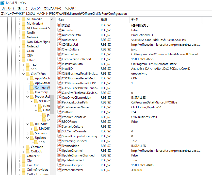 レジストリキー:HKLM¥SOFTWARE¥Microsoft¥Office¥ClickToRun¥Configuration