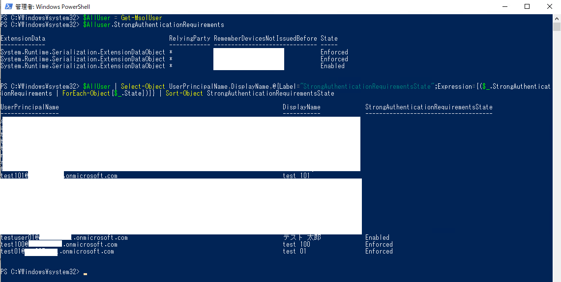 > $AllUser | Select-Object UserPrincipalName,DisplayName,@{Label="StrongAuthenticationRequirementsState";Expression={($_.StrongAuthenticationRequirements | ForEach-Object{$_.State})}} | Sort-Object StrongAuthenticationRequirementsState