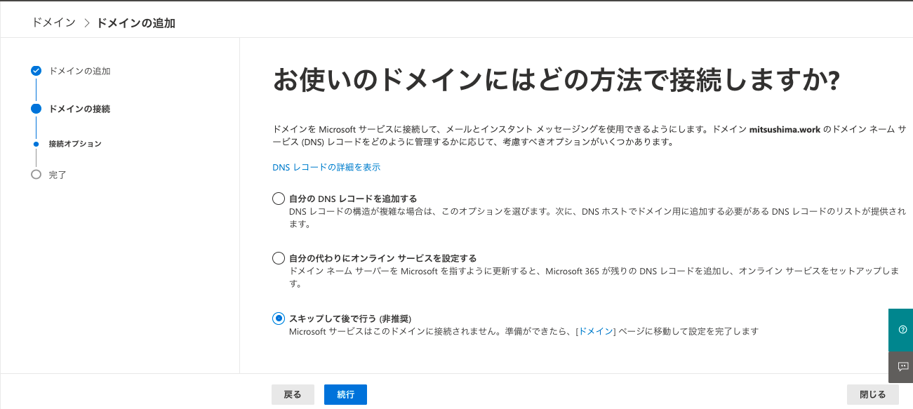 接続オプション画面では一旦「スキップして後で行う(非推奨)」を選択して、「続行」します。