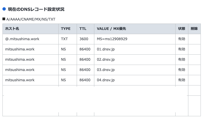 (注)この後Exchange Onlineを使用する為には、MXレコード・CNAMEレコード・SPFレコードの追加(編集)が必要となります。この辺りの検証は以下を参照ください。