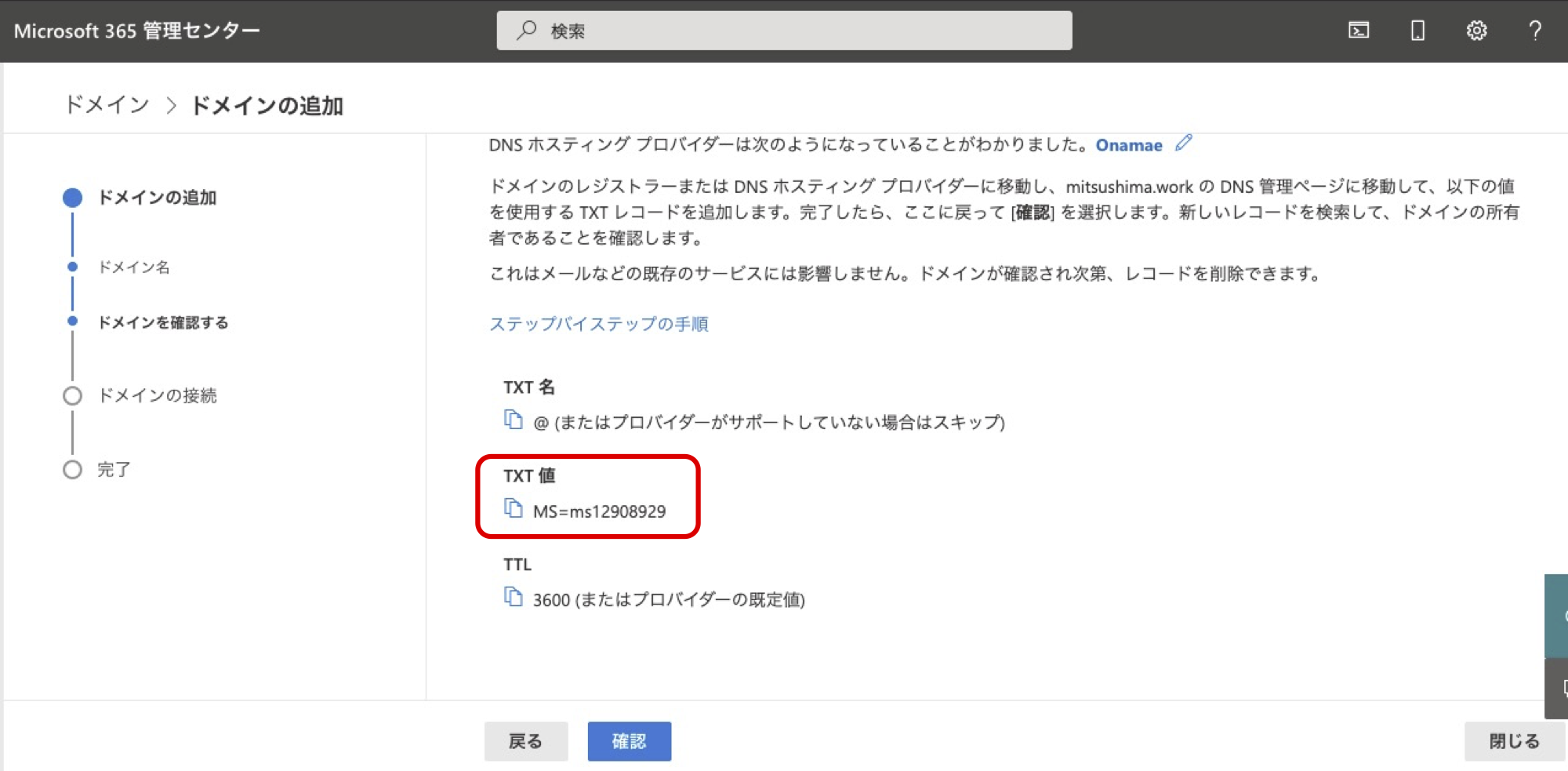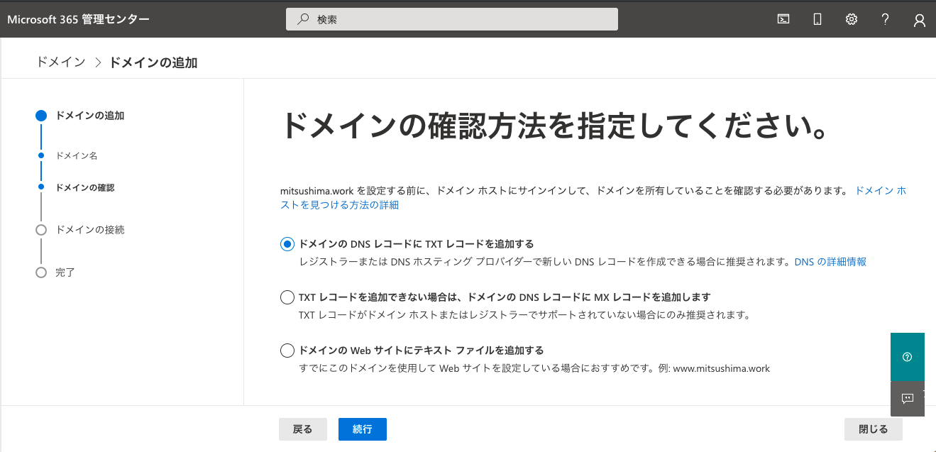 また、ドメインの所有者確認方法ですが、一番オーソドックスなTXTレコードの追記・確認手順となります。