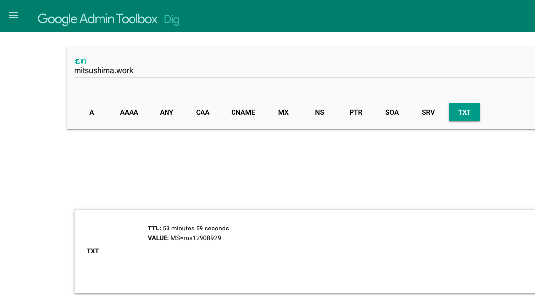 設定したDNSレコードが反映されているかは「nslookup」コマンドや「Google Admin Toolbox Dig」サイトで確認すると良いかな〜と思います。