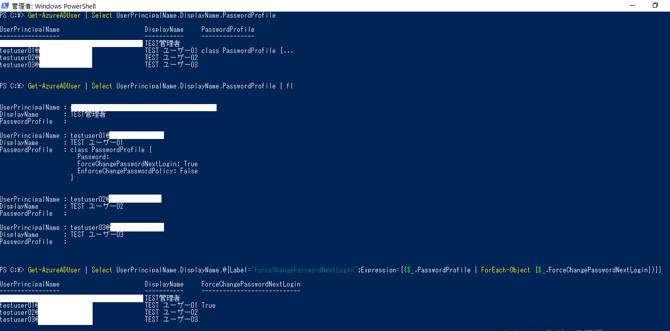 > Get-AzureADUser | Select UserPrincipalName,DisplayName,@{Label="ForceChangePasswordNextLogin";Expression={($_.PasswordProfile | ForEach-Object {$_.ForceChangePasswordNextLogin})}}