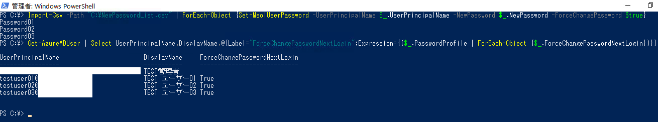 > Import-Csv -Path <CSVファイルのフルパス> | ForEach-Object {Set-MsolUserPassword -UserPrincipalName $_.UserPrincipalName -NewPassword $_.NewPassword -ForceChangePassword $true}