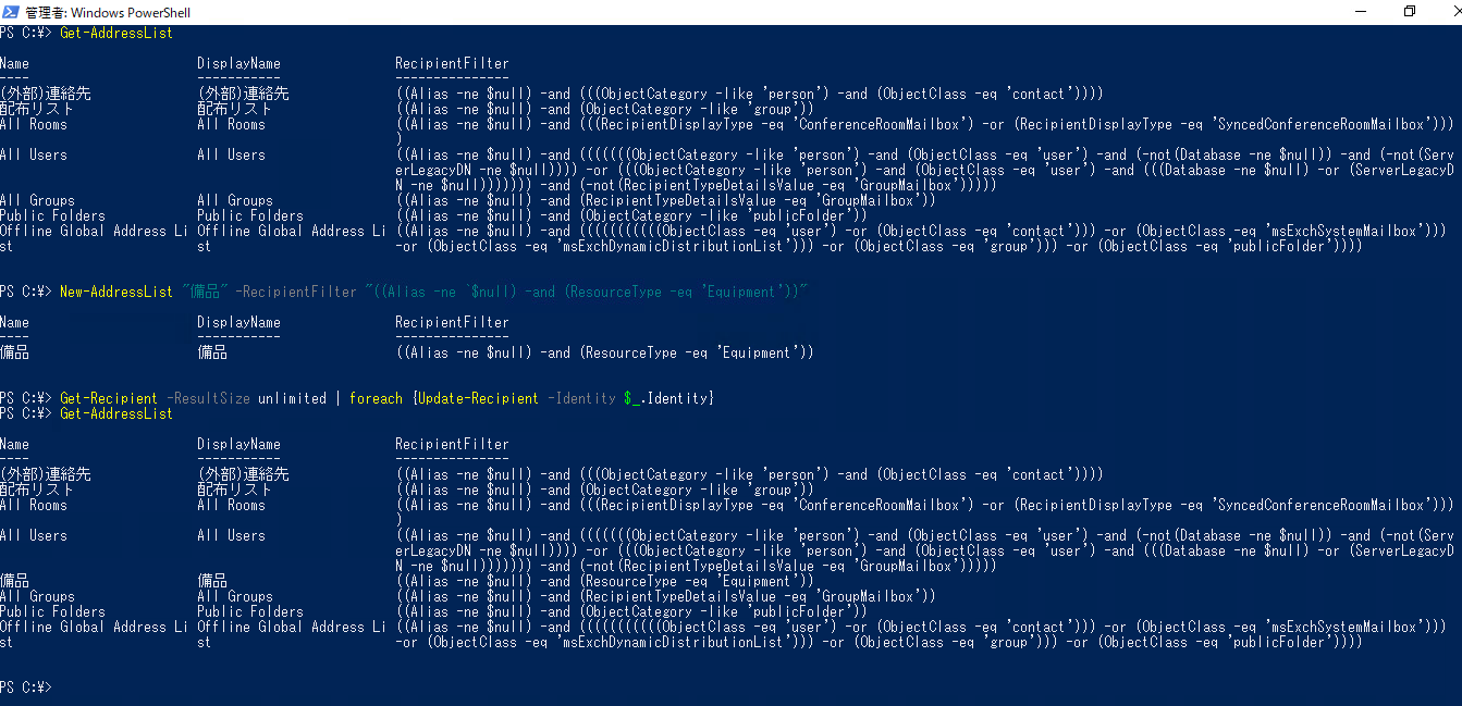 New-AddressList "備品" -RecipientFilter "((Alias -ne `$null) -and (ResourceType -eq 'Equipment'))"