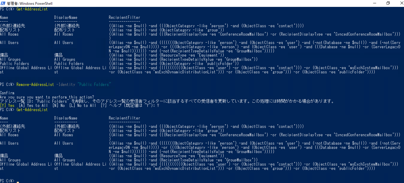 削除する際に使用するPowershellコマンドは「Remove-AddressList」です。※本当は削除ではなく、無効化(非表示)するようなパラメータがないかを探したのですが、見当たらなかったので・・・(^_^;)
