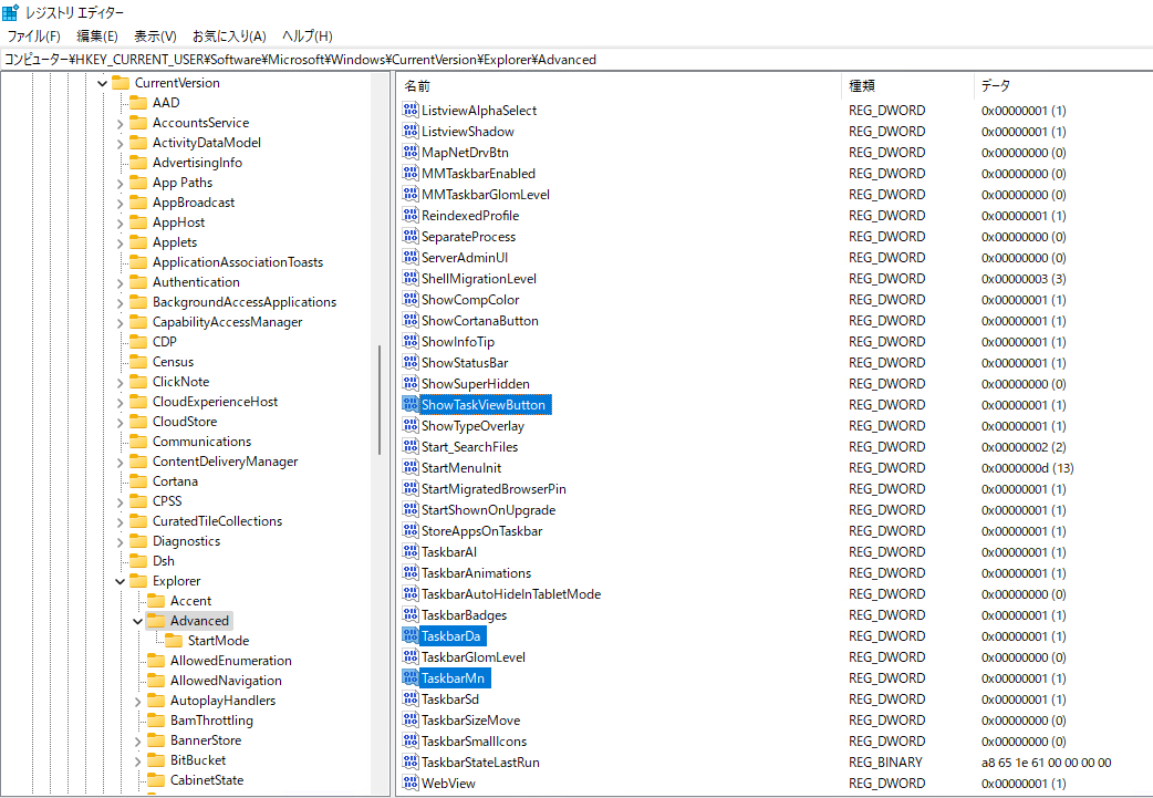 | レジストリキー | HKEY_CURRENT_USER\Software\Microsoft\Windows\CurrentVersion\Explorer\Advanced |