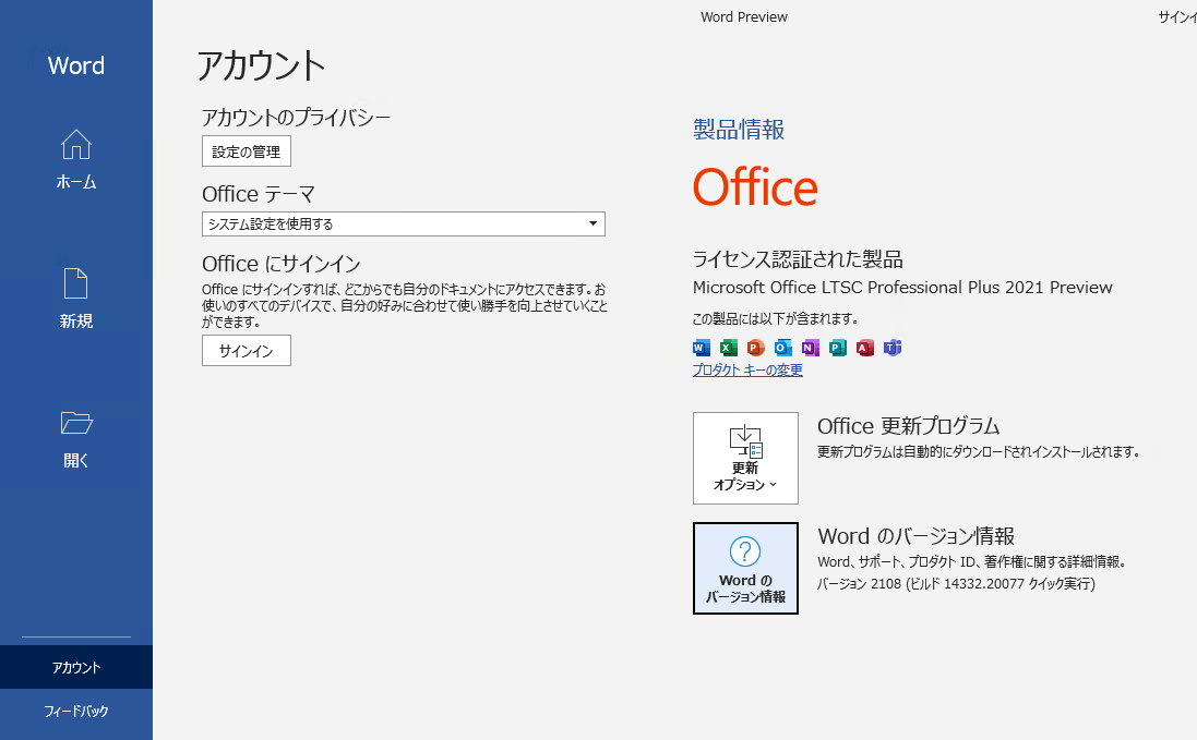 今回は公開されている「Office LTSC Professional Plus 2021 プレビュー版」をインストールしてみました。
