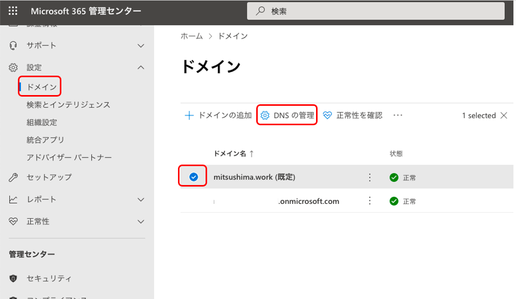 Microsoft365管理センターにアクセスし「設定」-「ドメイン」から対象のカスタムドメインを選択して、「DNSの管理」をクリックします。