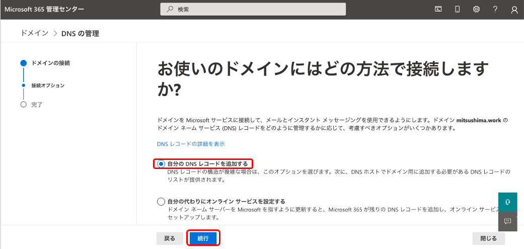 DNSへCNAMEレコード追加後に「続行」をクリックして、問題なく確認が取れれば登録が完了します。