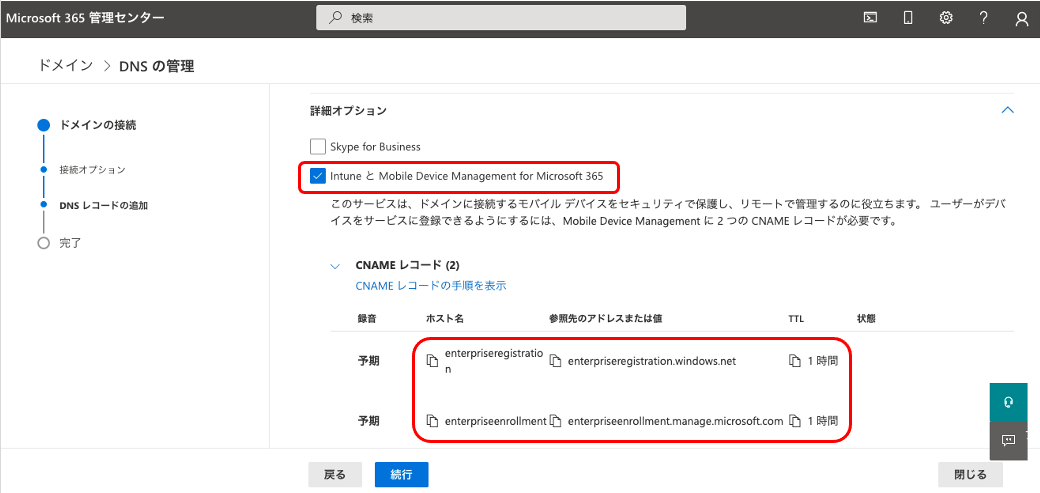 「DNSレコードの追加」にて「IntuneとMobile Device Management for Microsoft 365」にチェックを入れて、