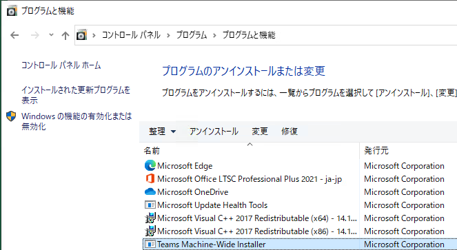 コントロールパネルを確認すると「Teams Machine-Wide Installer」がインストールされることがわかります。