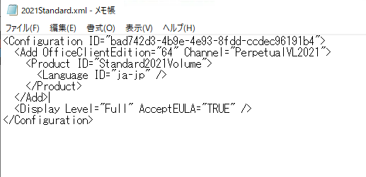 展開後の「configuration-Office2021Enterprise.xml」の中身を確認すると「LTSC Professional Plus 2021」の例が記載されていることがわかります。