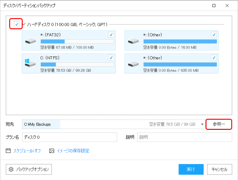 対象のハードディスクにチェックを付け、宛先(バックアップ先)を変更するために「参照」をクリックします。