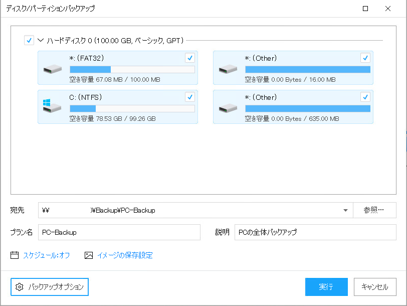 指定したフォルダ配下に「PC名」-「バックアッププラン名」のフォルダが自動作成され、
